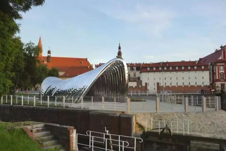 波兰设计师奥斯卡·齐塔(Oskar Zieta)利用他计划用于大型建筑作品的充气钢技术在弗罗茨瓦夫创建了一个公共雕塑。Nawa馆安装在Daliowa,这是奥得河中许多小岛之一,穿过弗罗茨瓦夫。