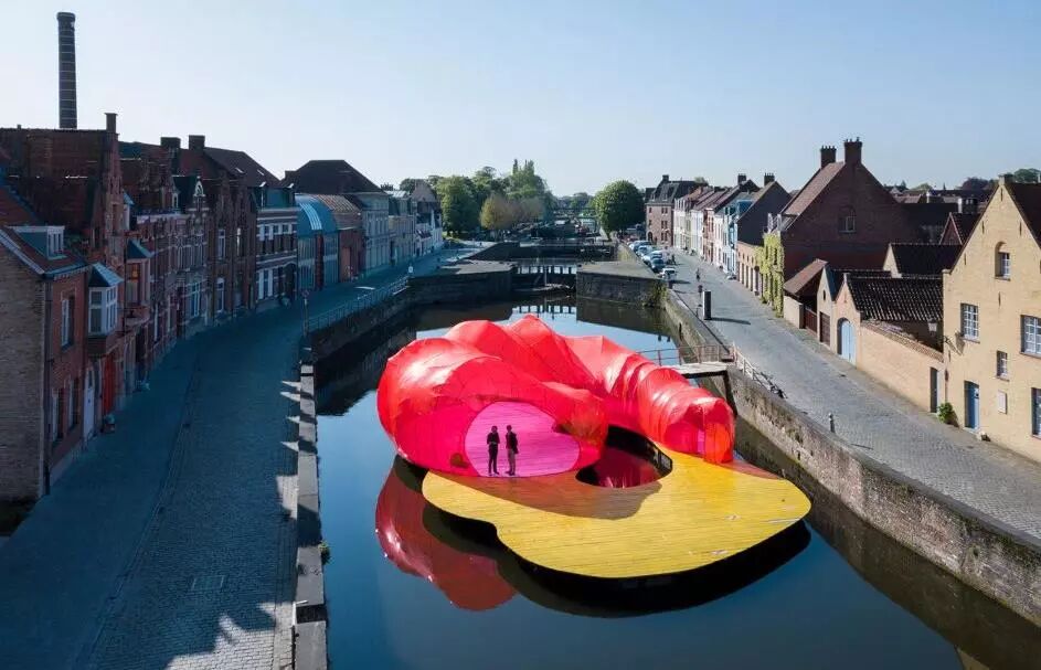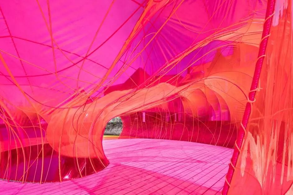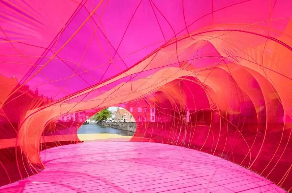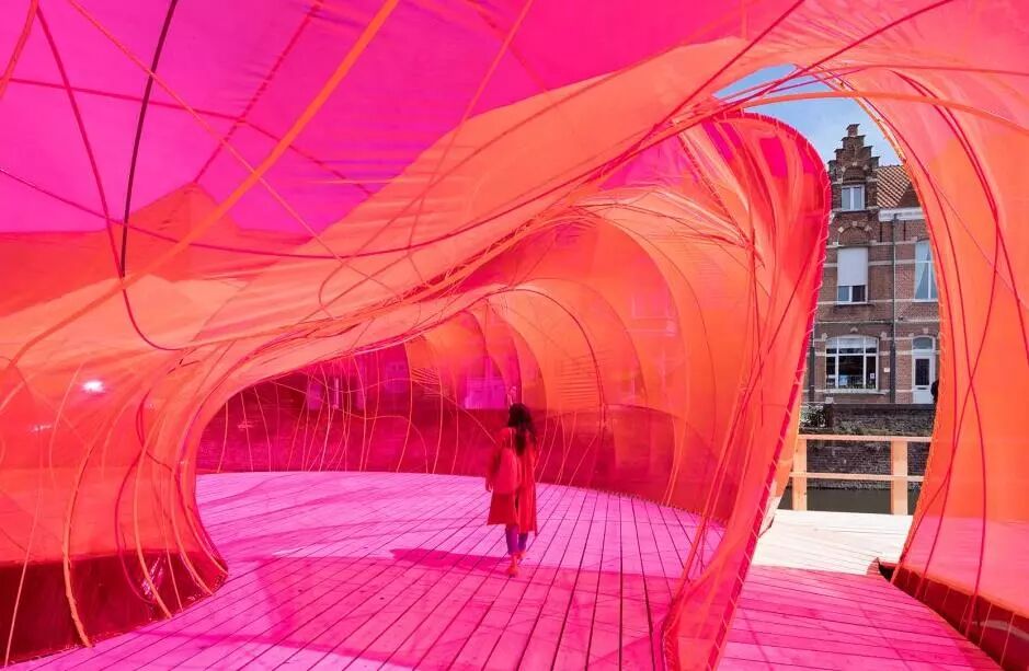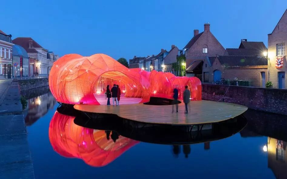Selgascano馆是布鲁日三年展上的游泳装置。该装置由布鲁日市政府组织搭建,它漂浮在Coupure运河上,是河道沐浴游泳的服务性平台,也是运河游览的新去处。该装置由一系列钢杆结构组成,外部由橘粉色乙烯基塑料围合,是一种创新性的建筑材料应用。在该装置中,钢结构与塑料外表皮相辅相成,不可分割。装置整体于场地中手工打造,并根据实际场景进行适当的拉伸和调整。