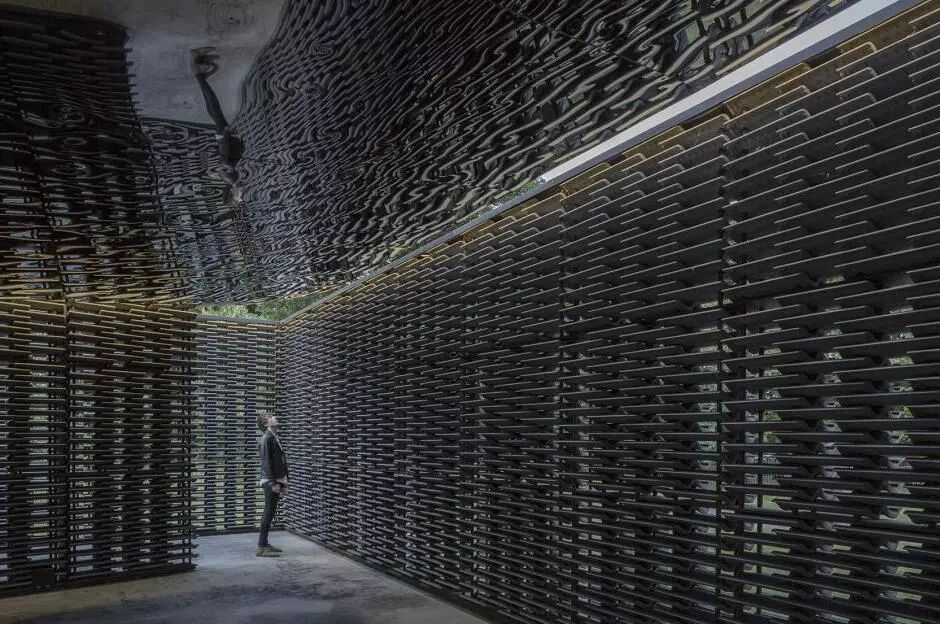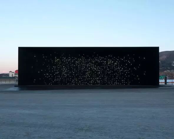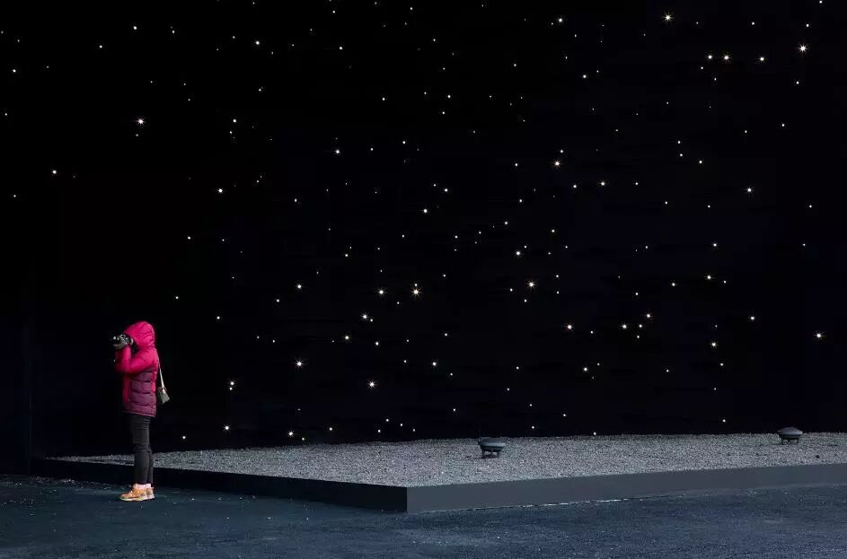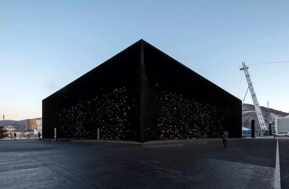 该项目是Asif Khan建筑事务所受现代汽车公司委托,为韩国平昌冬季奥运会设计的一座展馆,它被称为“全世界最黑的展馆”。这座35mx35m的建筑完全由一种叫做Vantablack VBX2的材料包覆,这种哑光的黑色材料能够吸收99%投射在表面上的光线并缩减其延展性,从而在白天的环境里创造出一种令人惊异的黑暗感觉。建筑的外立面装置着数千个白色的微型光源,为展馆赋予了星空般的梦幻观感。展馆的内部是一个巨大的“水室”,这是一个多感知型的疏水装置,每分钟会发射出2万5千个水滴。参观者可通过触觉传感器为不断碰撞、汇聚和分离的水滴赋予不同的节奏和韵律。这些水滴将持续地形成一个“湖泊”,在以分钟为单位的时空里不断地排空和重新涌现。