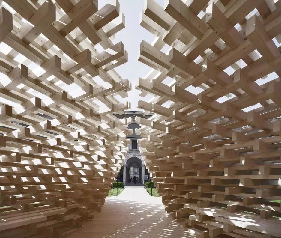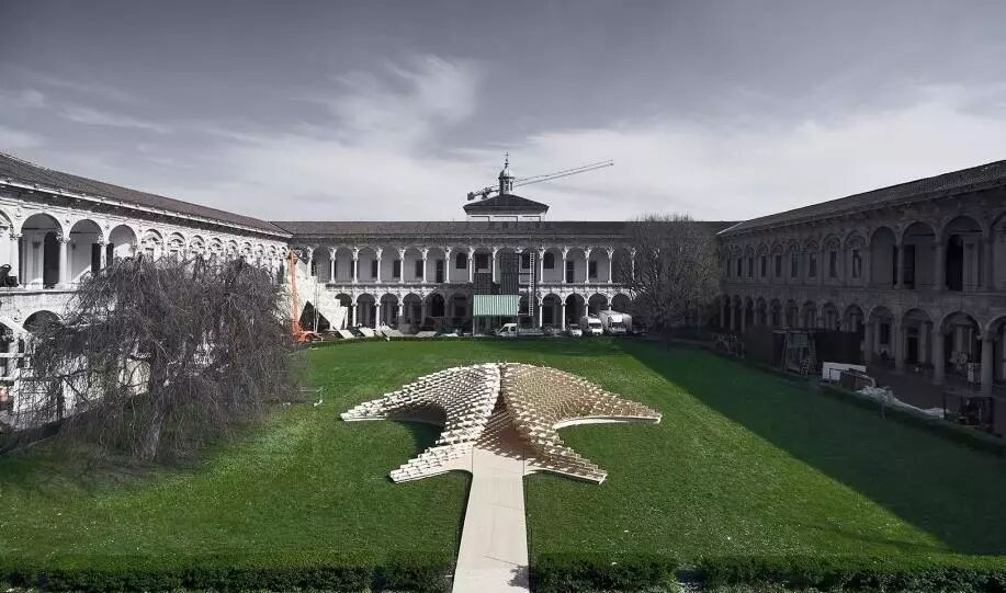 以文艺复兴建筑三个基本要素 – 对称、比例和几何为设计核心,这座呈对称形态的装置,在Ca’ Granda这栋米兰最经典的文艺复兴建筑之一的庭院里,展示其迷人的风采。该装置用富有体验性的方式,带领参观者探寻木结构在非典型建筑结构中的无限潜能。该装置展现了设计师工作室对未来空间的探索理念,即以木材作为主的可持续性材料,结构和空间情感。