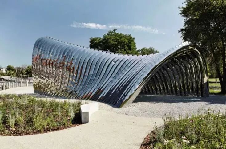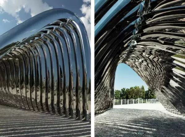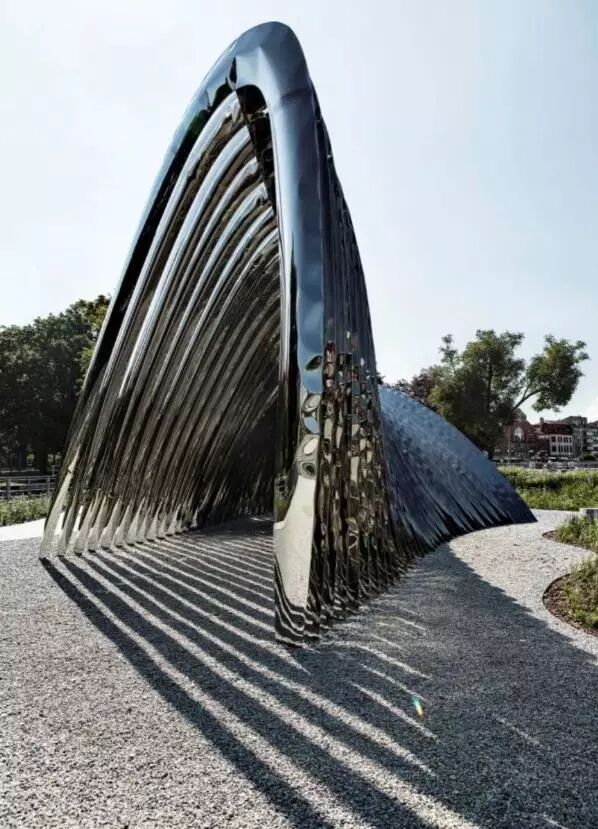 反射的起伏结构 ,由35个金属拱门组成,用空气雕刻,使两个薄钢板之间的空腔充气,边缘焊接。Nawa于2017年在Daliowa建立,作为振兴岛屿的计划的一部分,游客人数在下降。 它将作为永久性安装保留在那里。其抛光的钢表面反映了周围的环境,整天改变了雕塑的外观,而拱形的外观则看起来像是有机的,就像它可以“从地面直接生长”一样。