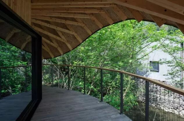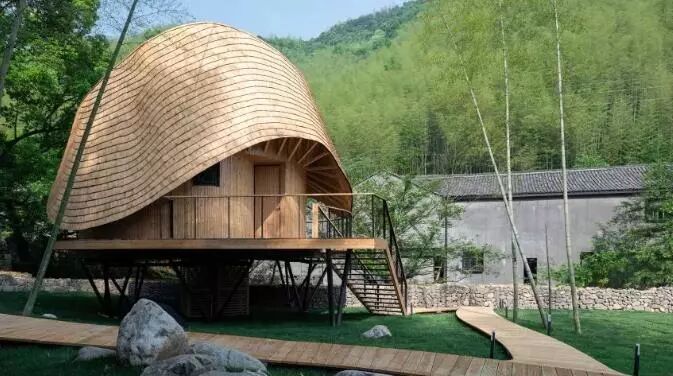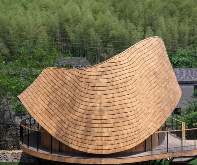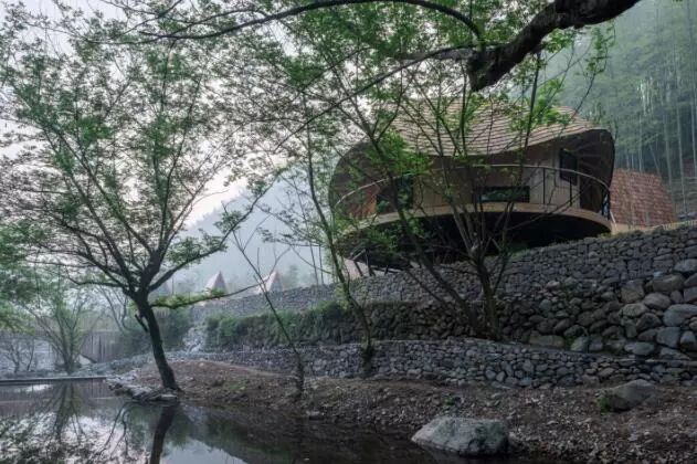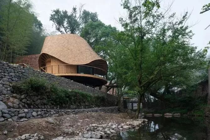 Treewow Retreat是一座中式村屋,设有圆形自由屋顶。它是一个不规则的波浪形屋顶,这个树屋灵感的度假别墅由建筑工作室Monoarchi建在一个偏僻的中国村庄。该建筑位于穿过村庄的溪流岸边,分为两部分。该场地两侧是竹子覆盖的山丘,横跨小溪,朝向前茶叶生产设施。倾斜的钢柱将舱室升高到地面以上,因此其露台延伸到水面上,并聚集在一起,以最大限度地减少对地球的破坏。尽管不是围绕树建造的,但是由此产生的结构被建筑师描述为树屋。