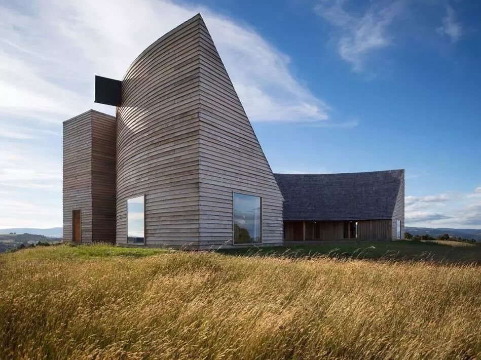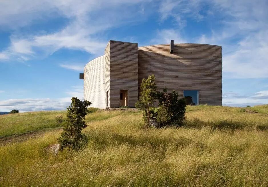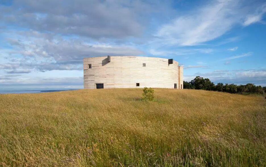 罗德住宅位于一片风景宜人、四季常青的草地,能够俯瞰奇洛埃岛的的内海,它是一座只有“一半”的房子,因为它由被“打断”的圆柱体和圆锥体构成;同时它也是一座“双倍”的房子,因为从建筑底部减去的矩形体量形成了一对大小相等的房间,分别位于线性序列的两端,并各自朝向南北两面。位于中间宽阔区域的是一系列平行的房间。屋顶覆盖着庭院的两个角落,使其免受雨水的侵袭;建筑的三个方向皆能够抵挡风吹。厚实的墙壁中容纳了所有的功能空间。这座弯曲的体量并不对称:从一边看,它是一座厚重的、与外界隔绝的避难所;从另一边看,它又呈现为一座几乎没有墙壁支撑的倾斜屋顶。