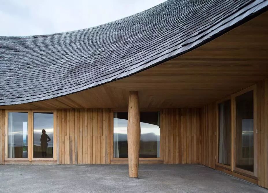 从上方看,建筑物似乎由三个偏移的圆圈组成:甲板露台,两层楼的宾馆和中央屋顶露台。建筑物的屋顶和墙壁由57个不同长度的木制桁架支撑,使得屋檐在客房环绕时不断变换高度。这种移动形式从位于木壳中不同点的窗户提供独特的视图。