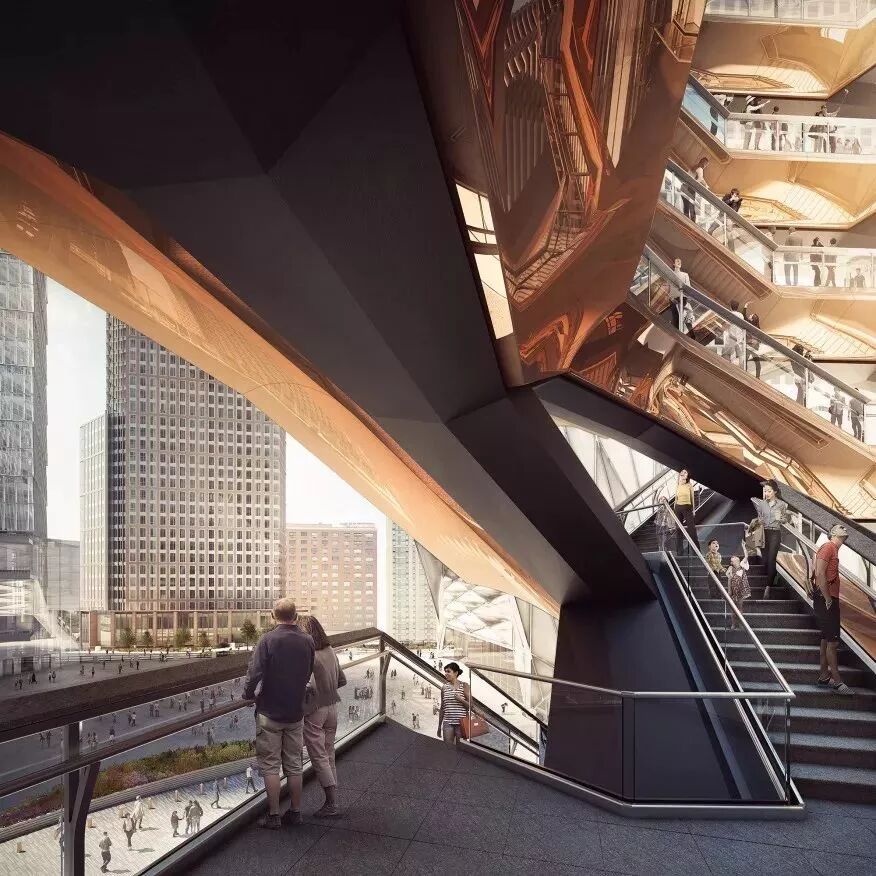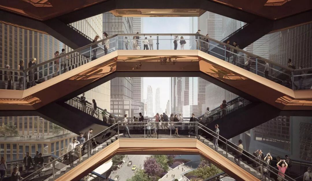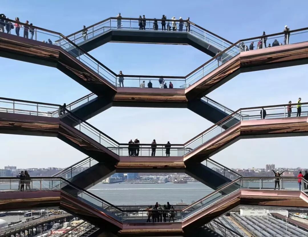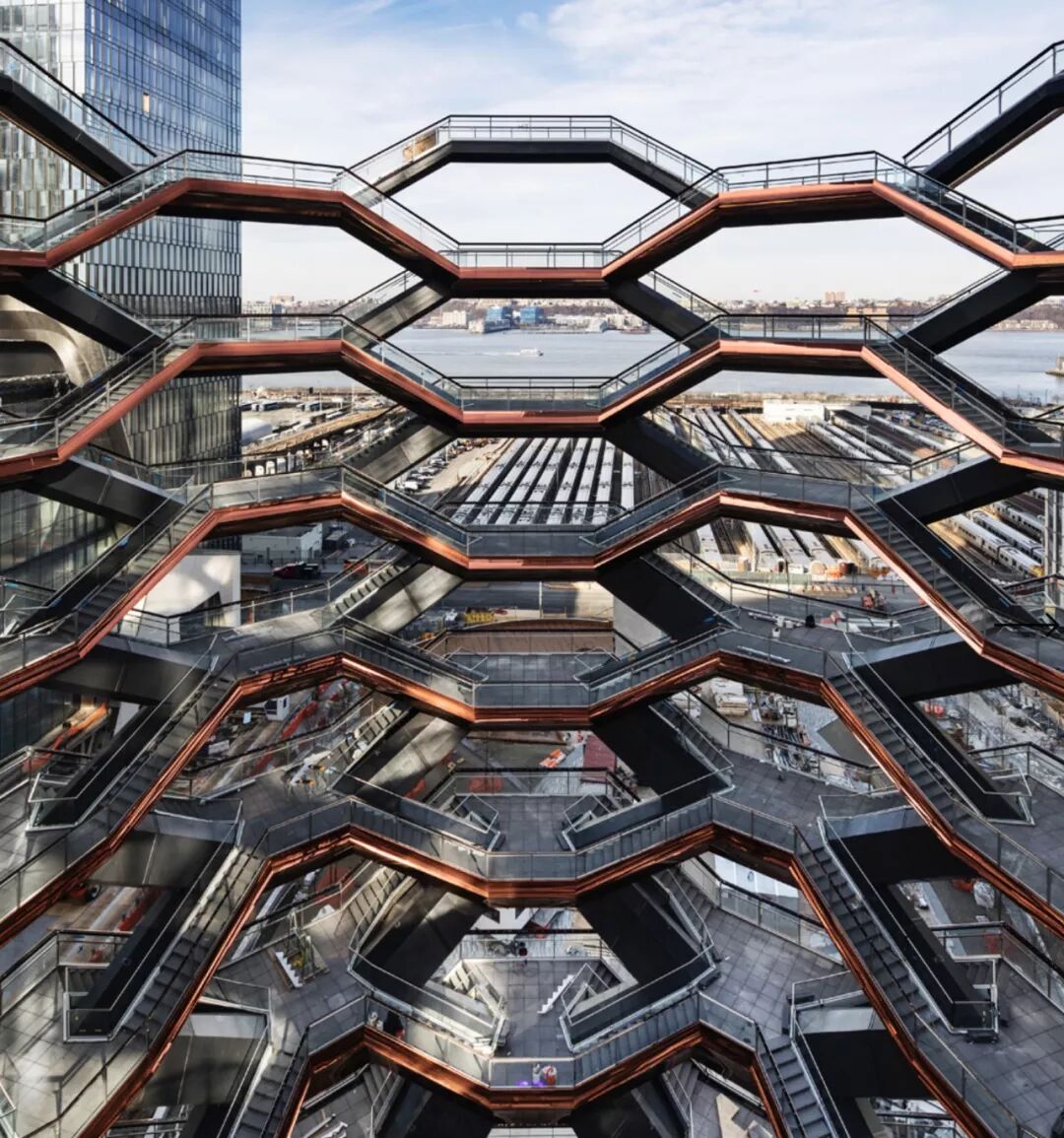 The Vessel灵感源自蜂窝,由8层重叠交织、连接互通的钢铸楼梯和平台构成。从直径15米的六角形底座开始,每层渐渐出挑加宽,而顶层的跨度则达到了46米。