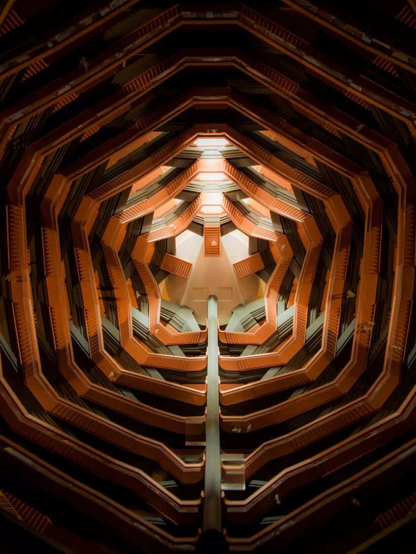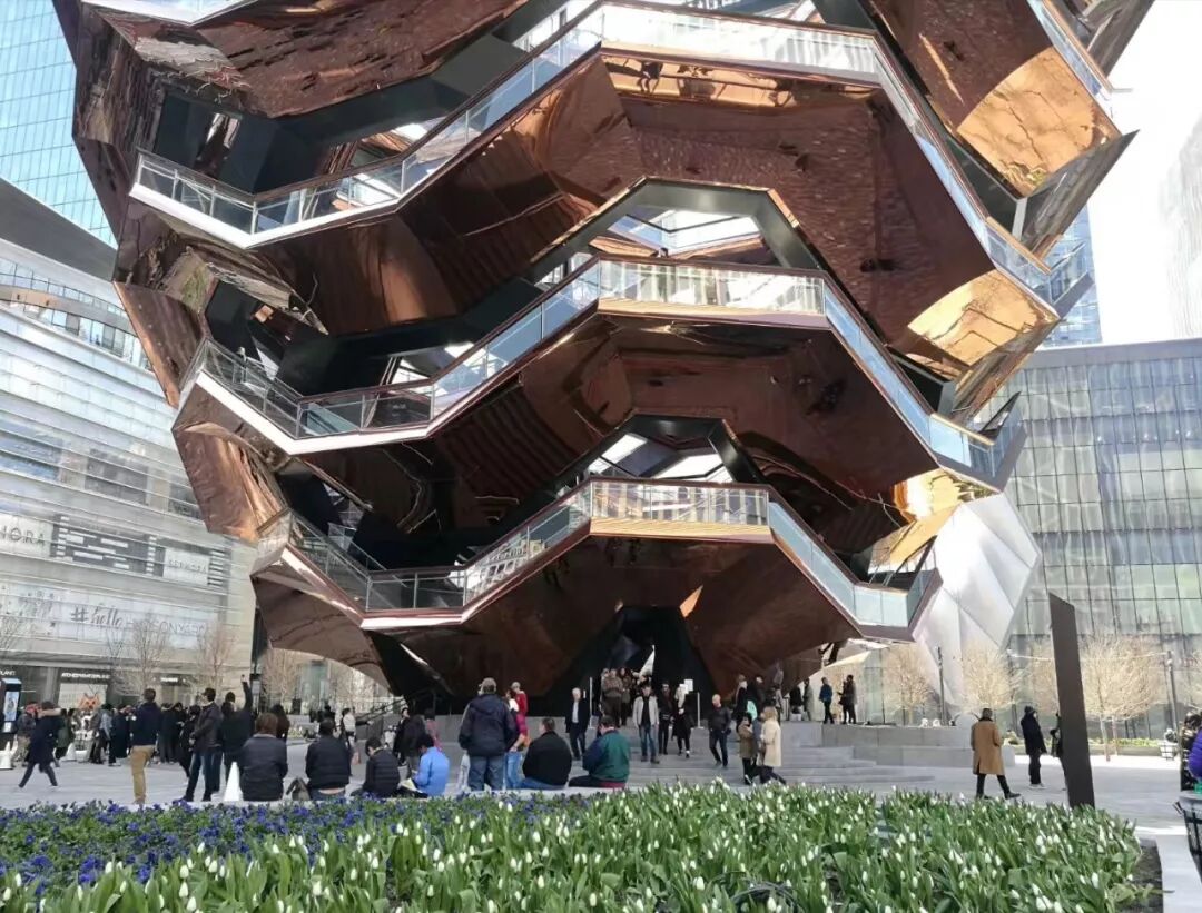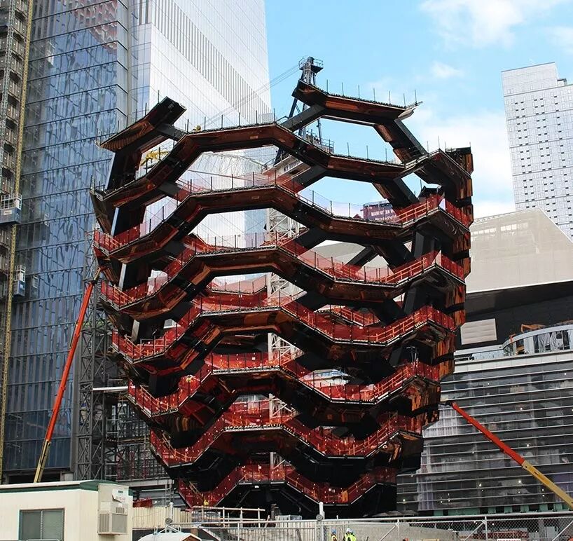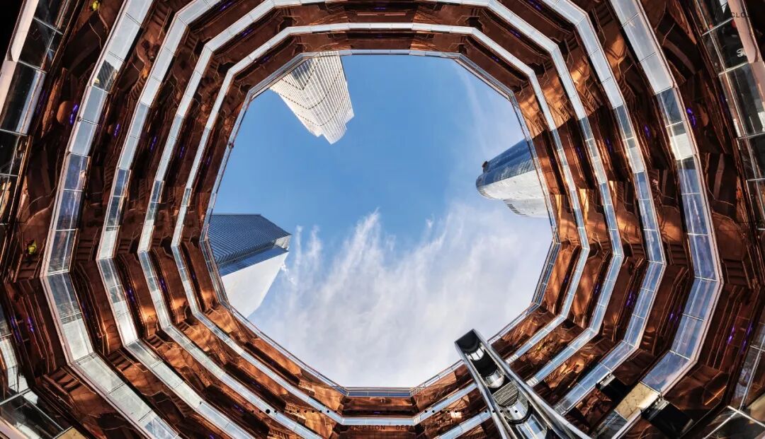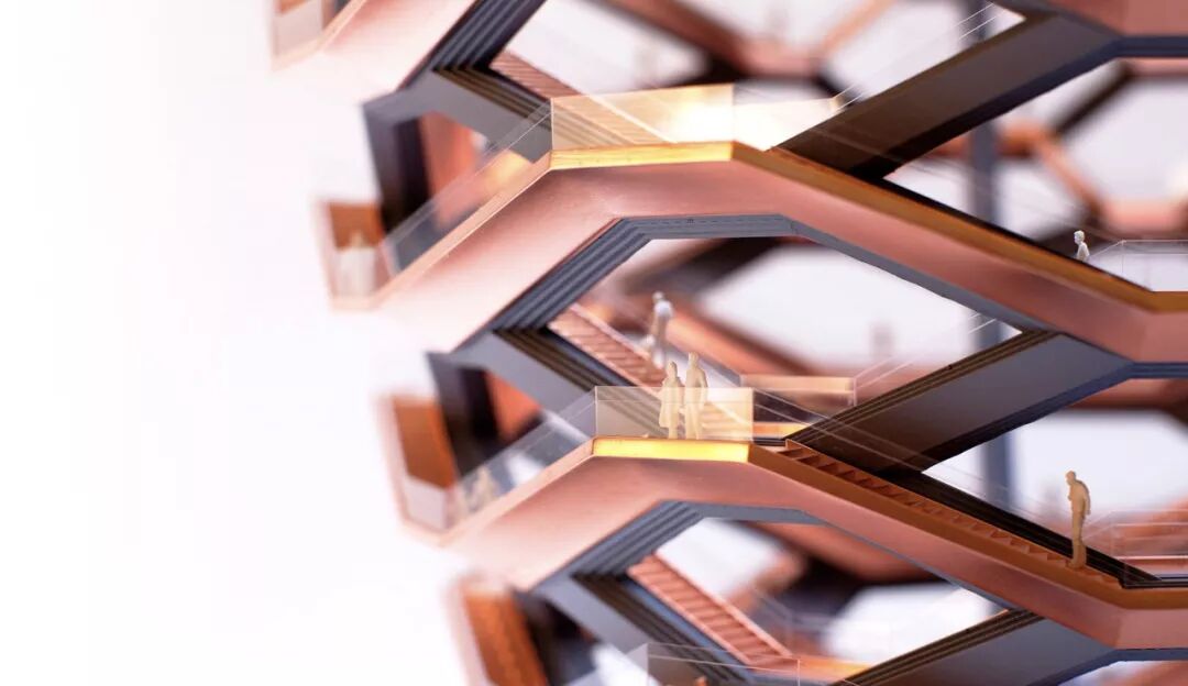 The Vessel灵感源自蜂窝,由8层重叠交织、连接互通的钢铸楼梯和平台构成。从直径15米的六角形底座开始,每层渐渐出挑加宽,而顶层的跨度则达到了46米。
