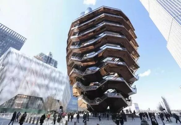 美国纽约曼哈顿哈得孙河畔拍摄的名为“Vessel”的景观建筑。位于Hudson Yards的景观通廊、广场中心和视觉焦点处的巨大构筑物,是由获得2016年设计终身成就奖的英国设计师Thomas Heatherwick(托马斯·赫斯维克)设计的The Vessel。